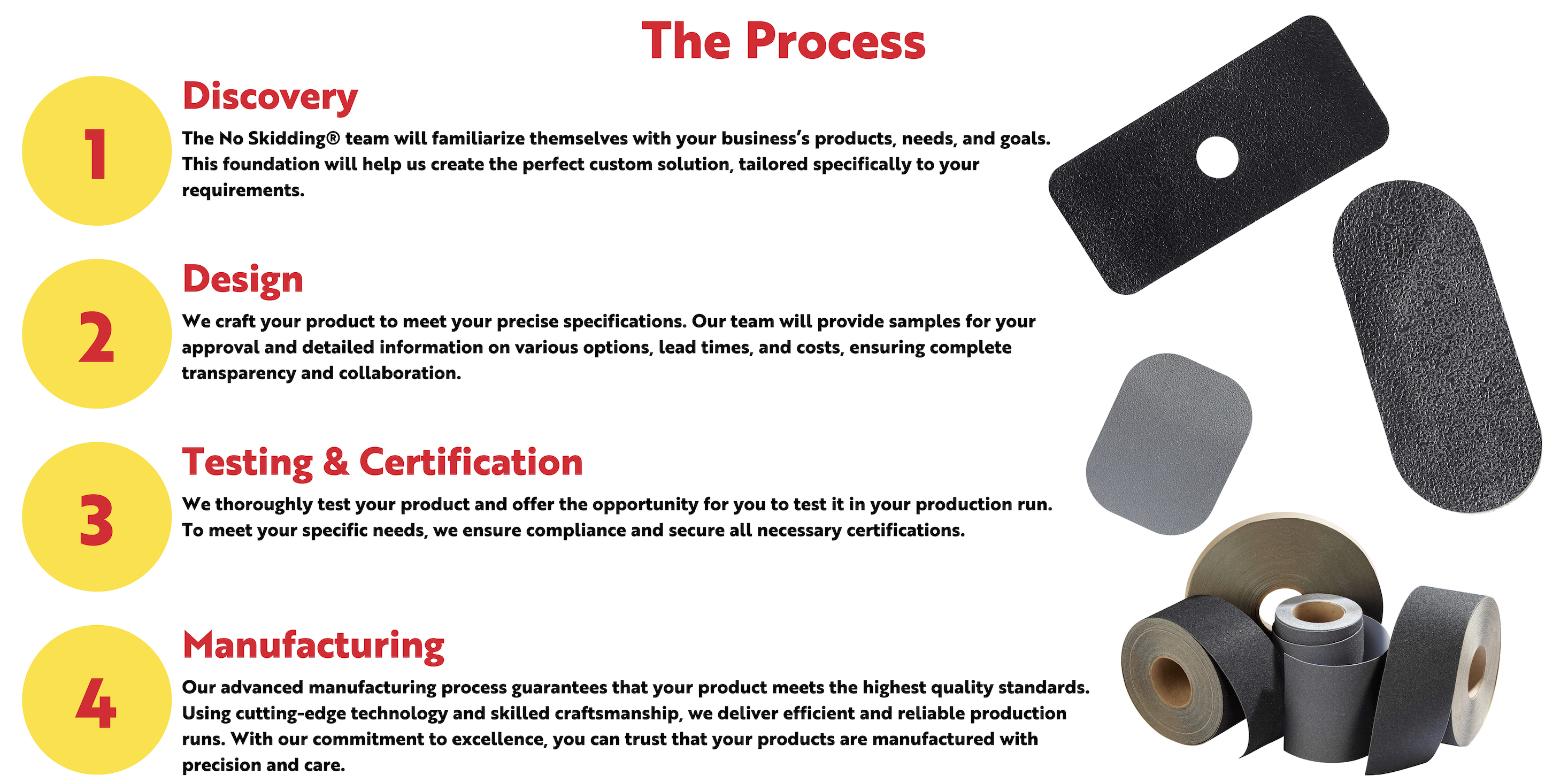 If you have a specialized application that demands the quality and durability of a No Skidding® anti-slip solution, we can engineer a custom product for you. We have custom capabilities for all shapes, sizes and adhesive systems, including anti-slip grit and glow-in-the-dark materials, as well as standard and rubberized vinyl.